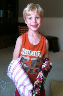 | Even though he felt so badly, he still asked if he could go pick out a toy from the treasure chest for his Bubba. He knows James loves the fans. |
