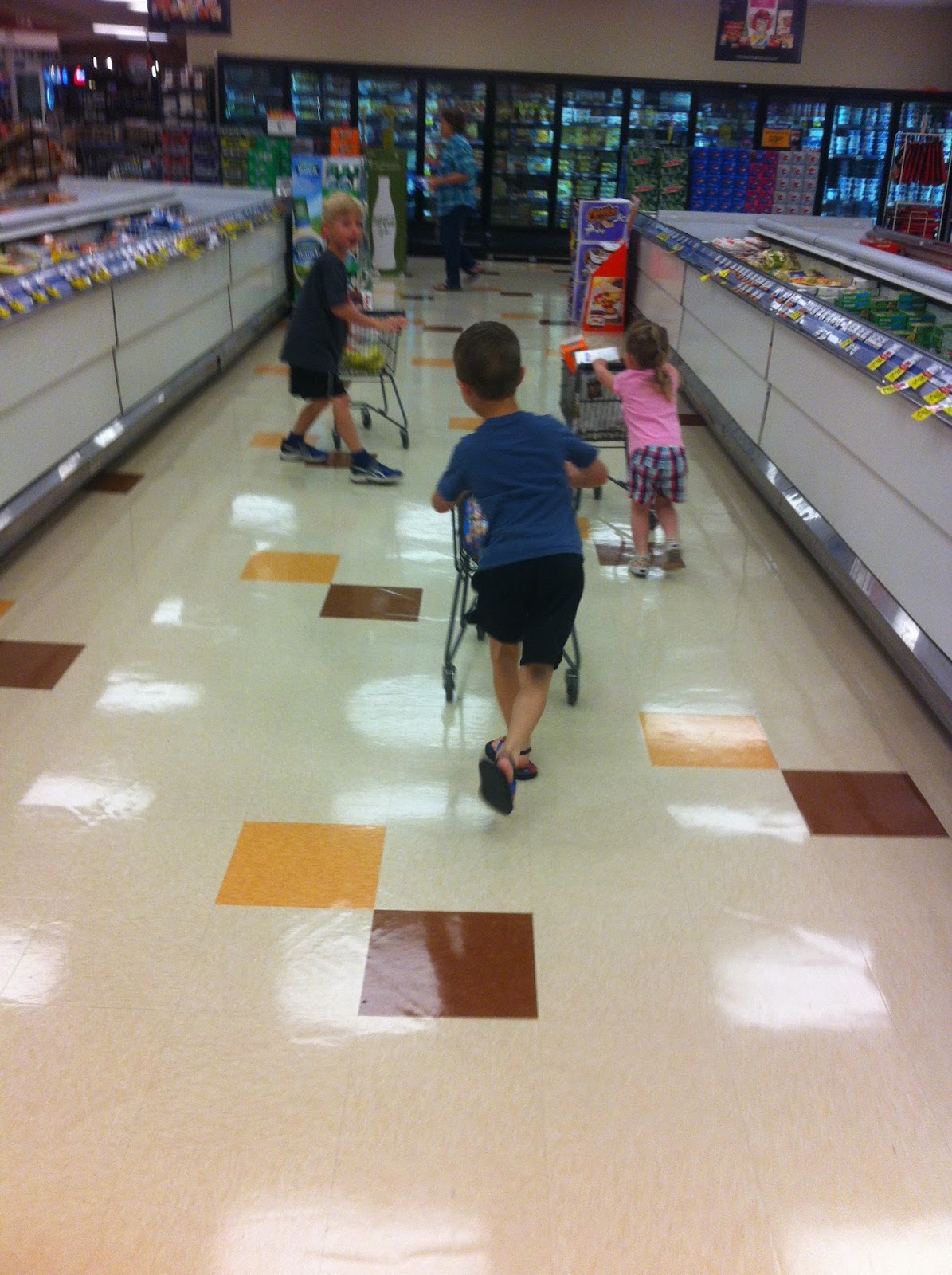 This craziness happened. Three kids...three tiny carts...the grocery store was never the same. What was I thinking????